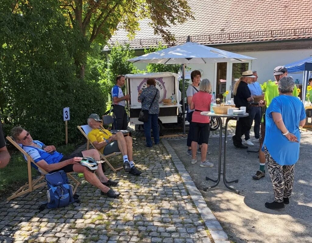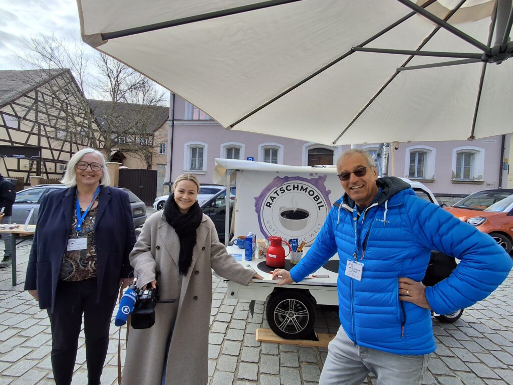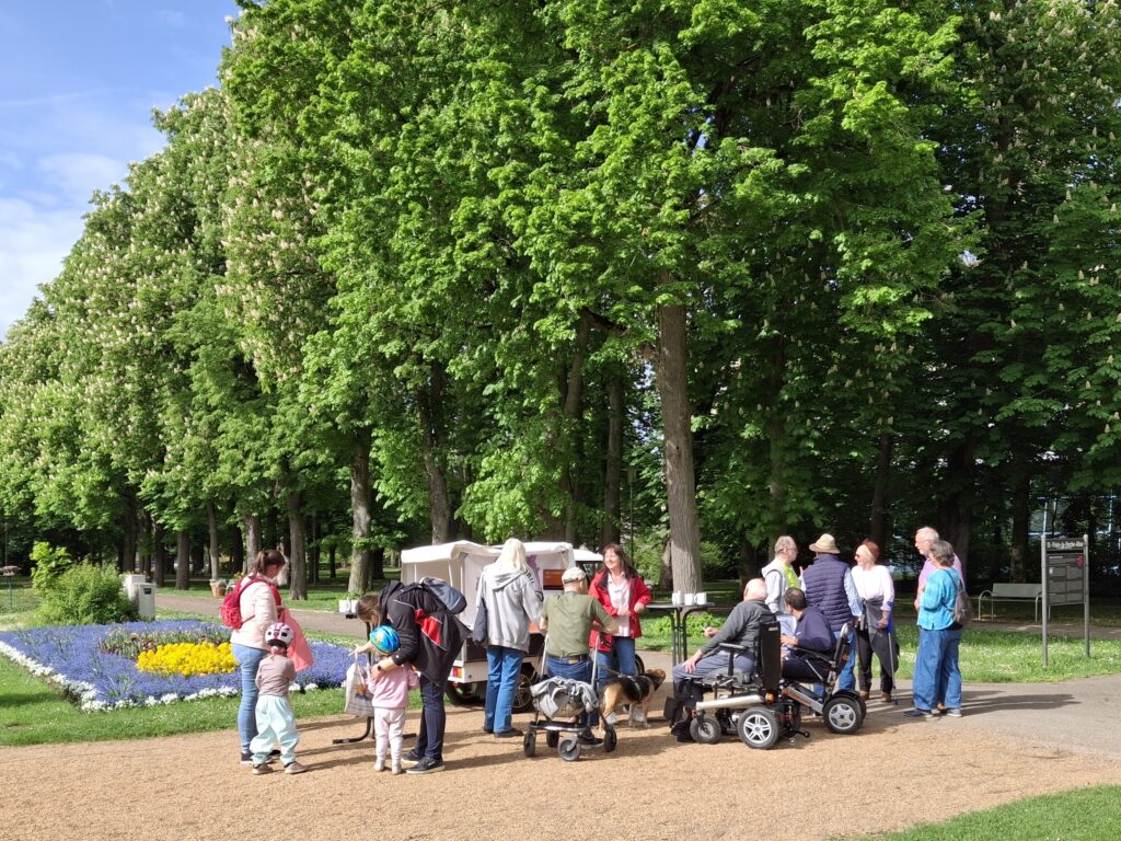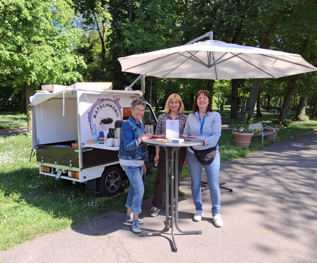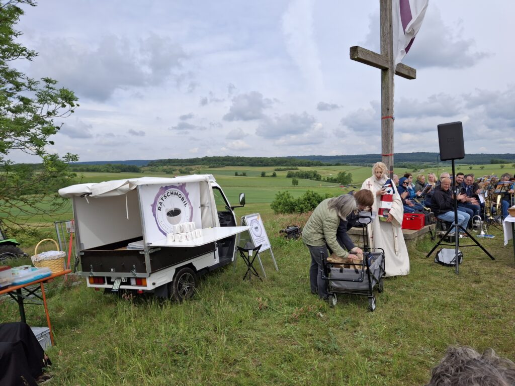 Seit Sommer 2023 sind Christinnen und Christen aus Kirchengemeinde, LKG und Elops mit dem Ratschmobil im Stadtgebiet unterwegs. Es kommt vielfältig zum Einsatz: für „Kinderkirche Kunterbunt“ auf den attraktiven Spielplätzen der Stadt, als kleine Bühne bei Stadtfesten und Flohmärkten oder mit Kaffeeaufbau als offener Plauderpunkt im weitläufigen Kurpark. Immer wieder bot das Ratschmobil die Gelegenheit, bei einer Tasse Kaffee ungezwungen über „Gott und die Welt“ ins Gespräch zu kommen: regelmäßig auf dem Wochenmarkt am Bad Windsheimer Marktplatz, im Kurpark, bei sommerlichen Freiluftgottesdiensten, beim Weinturmfestival sowie bei der BR-Radltour in Obernzenn.