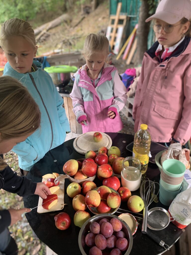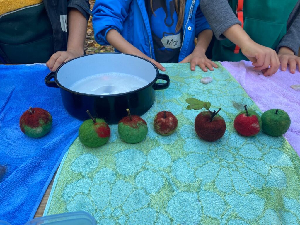Auf den Fotos: „Entstauben“ der Hütten, Holz machen und Apfelernte / Apfelkompott zubereiten während der Werkeltage; Äpfel filzen beim Naturgartentag des OGV; Beschilderung des WGM; Waldweihnacht